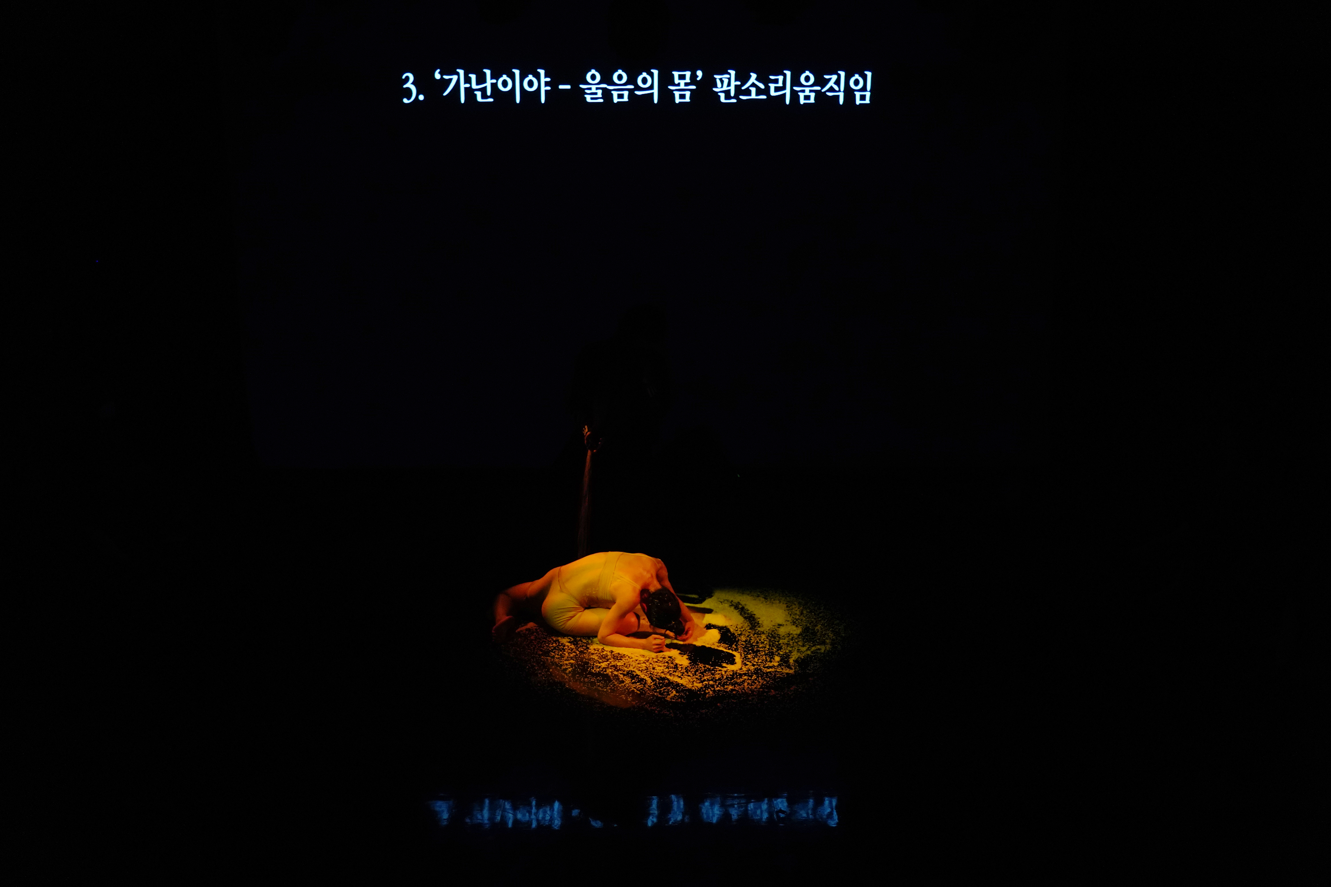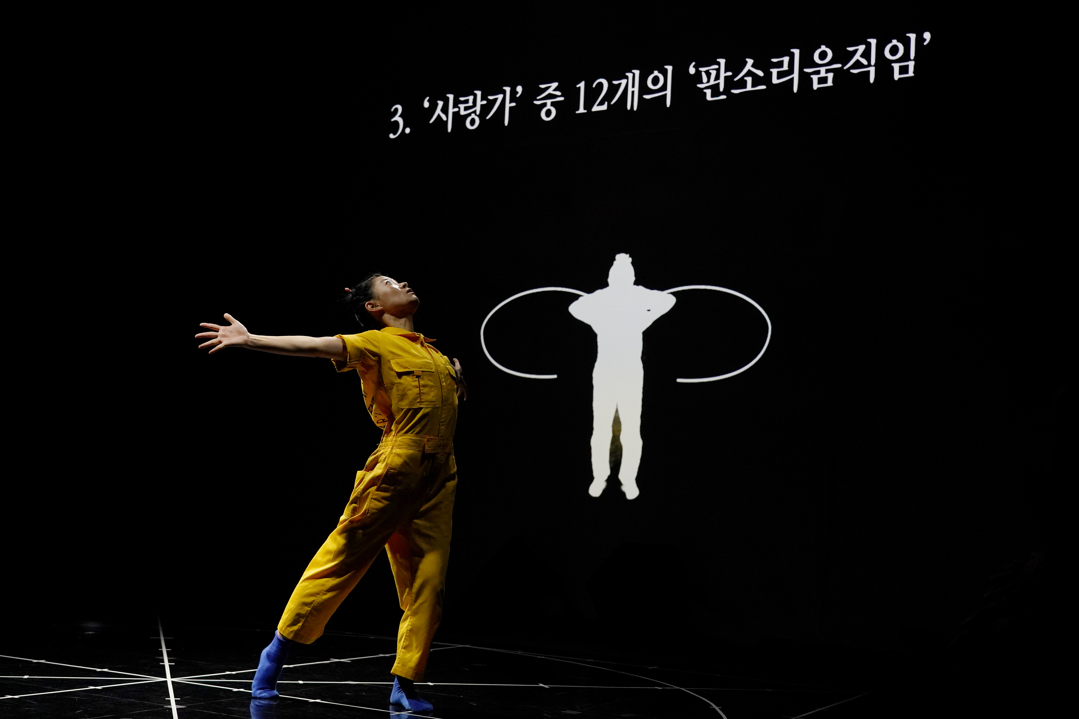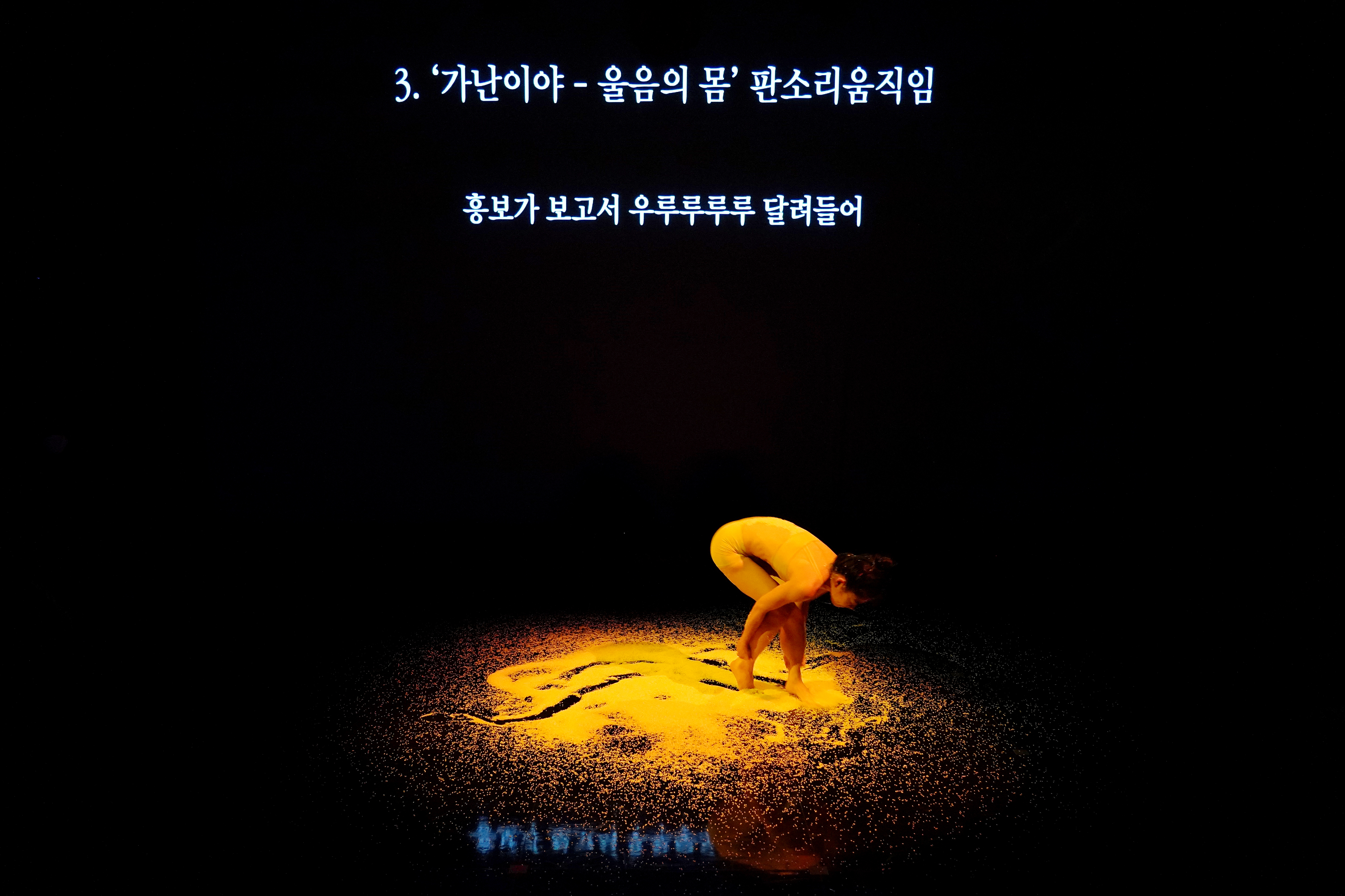 <판소리움직임 탐구 1>은 탐구의 시작으로, <춘향가> 중 ‘사랑가’ 한 대목을 통해 호흡이 장단이 되고, 장단에 얹힌 소리가 판소리가 되며, 판소리가 움직임으로 어떻게 변화하는지 탐구했다. <판소리움직임 탐구 1.3>에서는 <춘향가> 중 ‘사랑가’와 더불어 <흥보가> 중 ‘가난이야’를 중심으로 ‘울음의 몸’을 탐구하는 과정까지를 ‘렉처 퍼포먼스’ 형태의 쇼케이스로 선보인다.