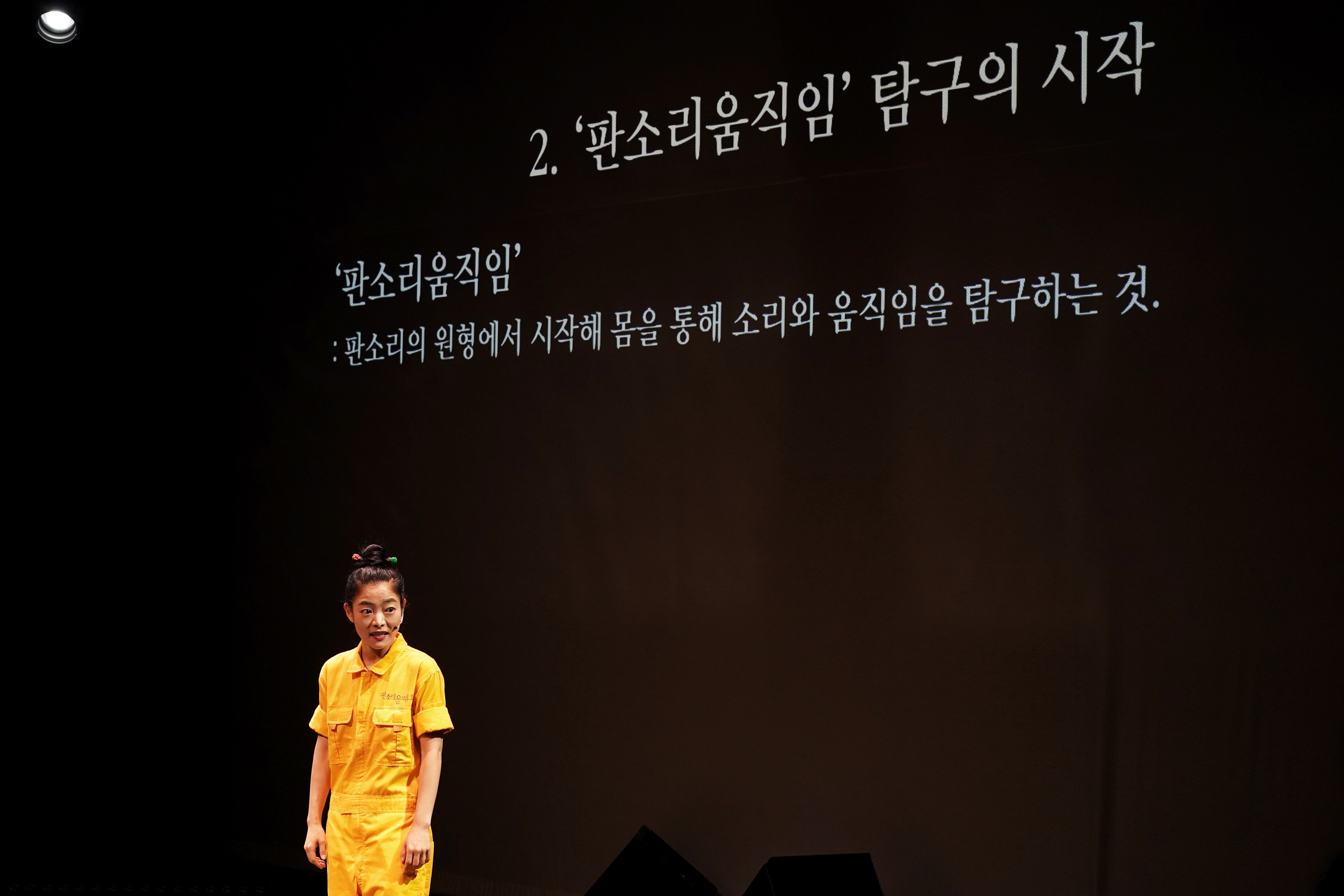 <판소리움직임 탐구>는 판소리로부터 시작하는 움직임이란 무엇일까, 라는 질문에서 시작한다. ‘판소리움직임’은 ‘몸소리말조아라’의 조아라가 고안해낸 용어로, 판소리의 원형으로부터 출발해 소리와 움직임을 통합하고 유기적으로 상호작용할 수 있게 하는 방법을 말한다. 호흡, 소리, 움직임이 자연스럽게 연결되고 변화하며, 끊임없이 생동하는 에너지로서 현존하는 것이 <판소리움직임 탐구>의 지향점이다.