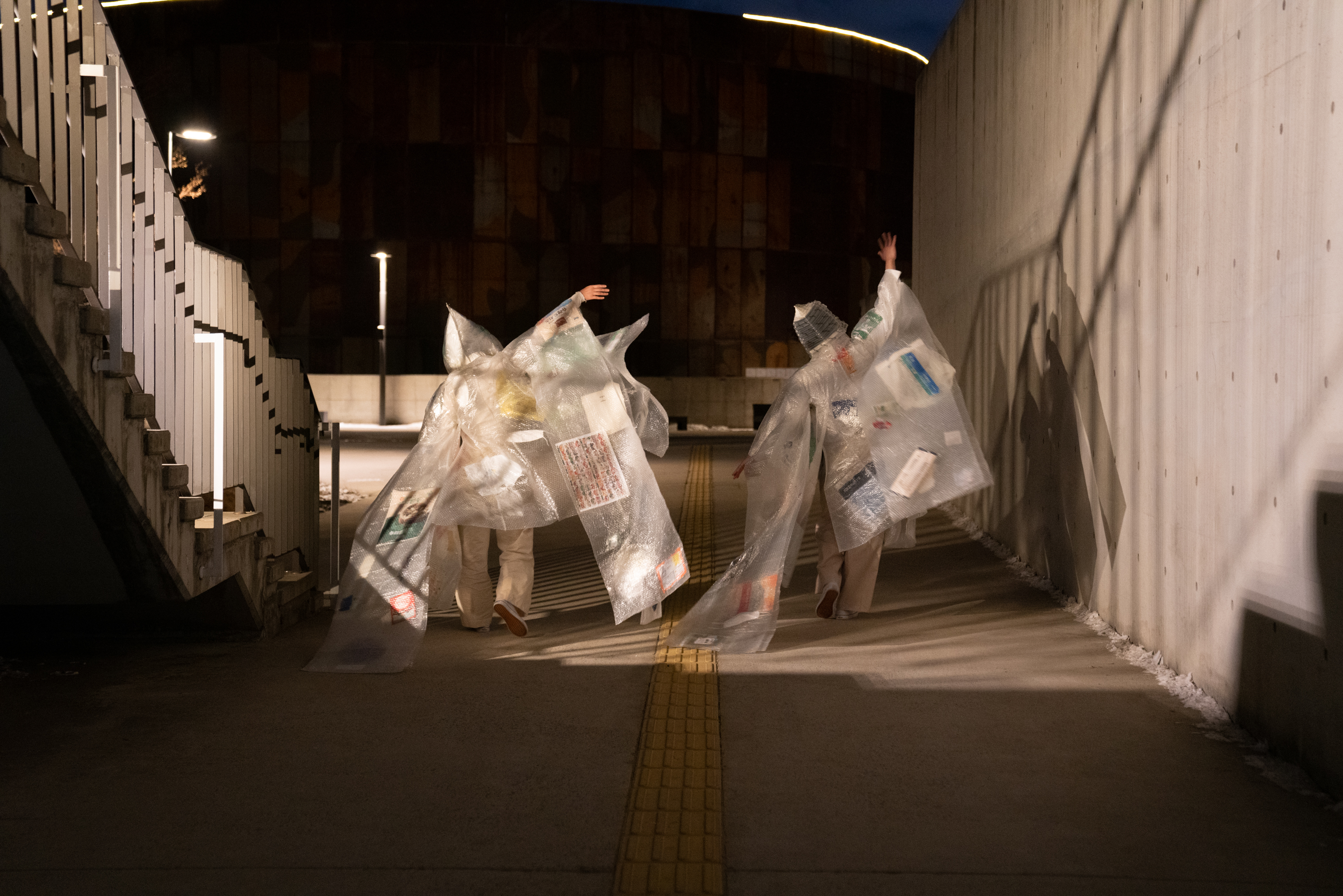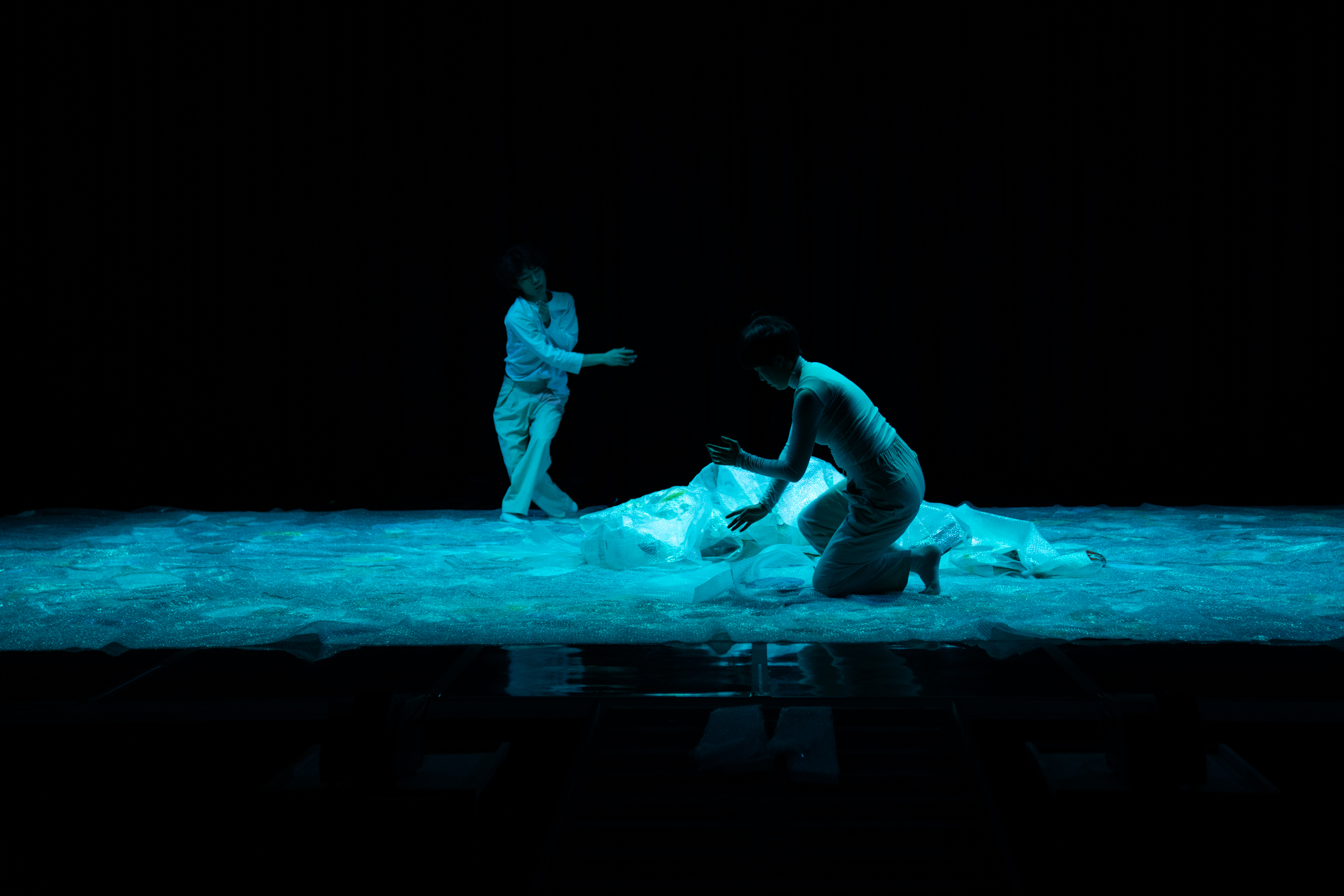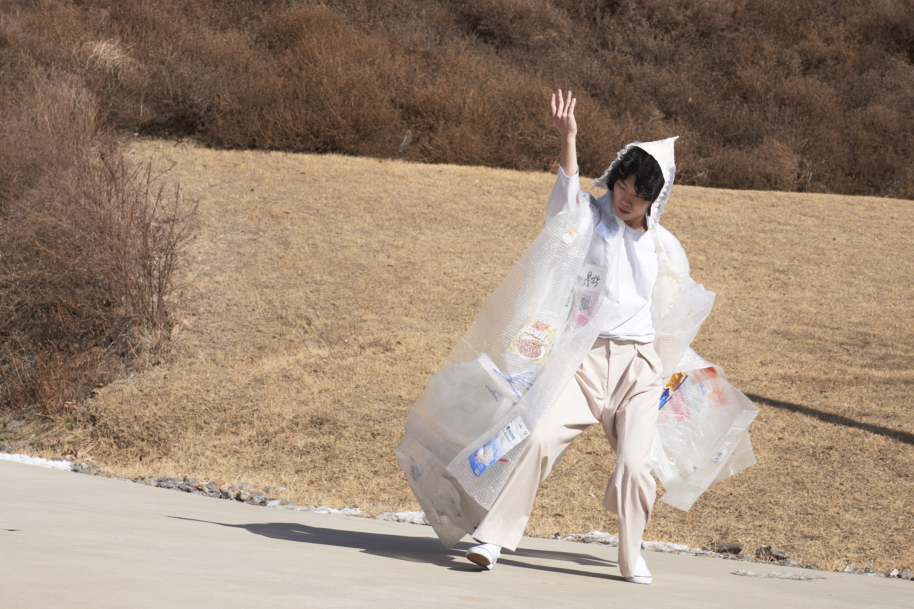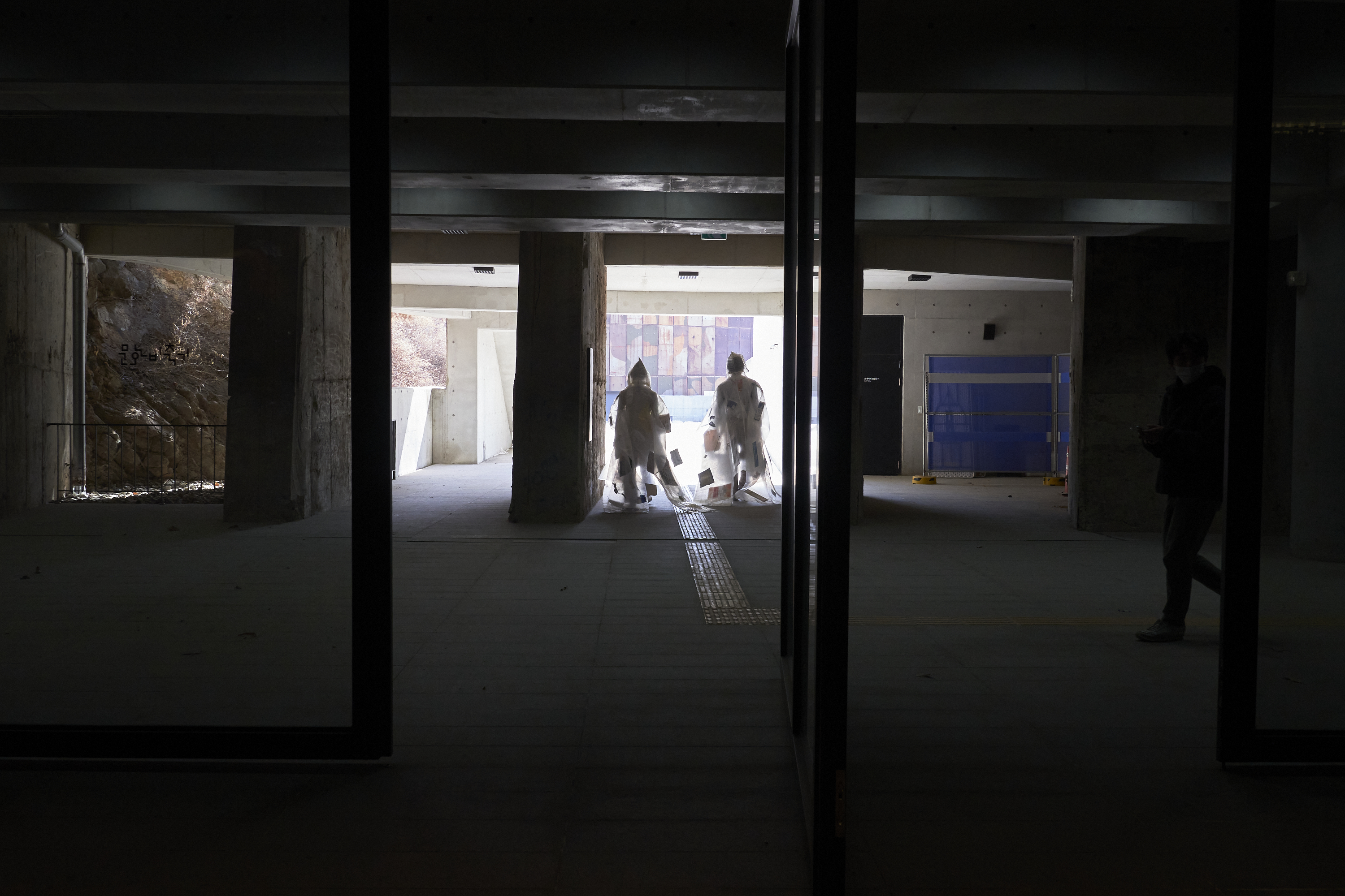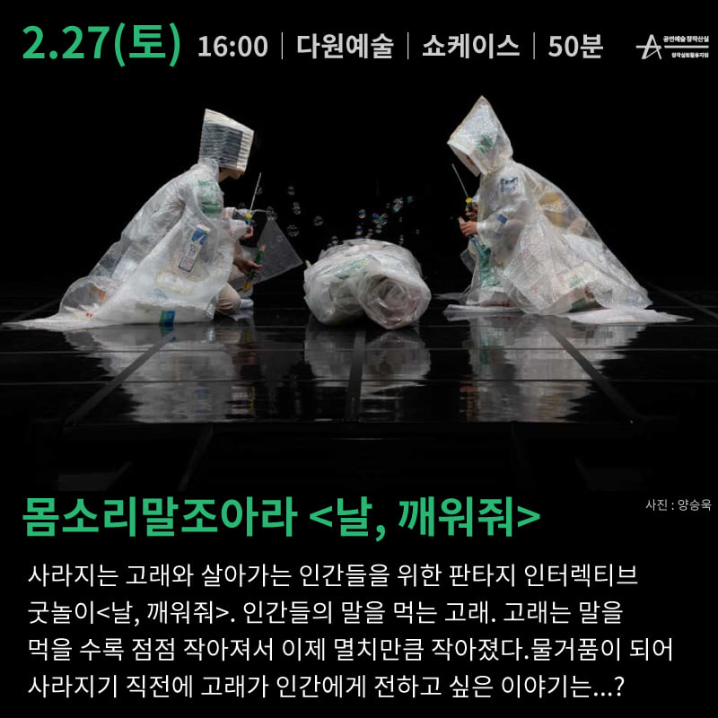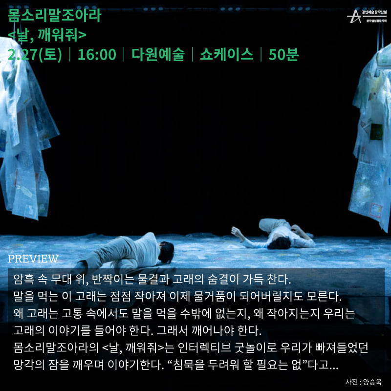<날, 깨워줘>는, 주제적인 측면에서 소멸되는 과정에 있는 마을굿에 가까우면서 동시에 씻김굿의 방향성을 띠고 있다. 지금껏 인간 사회를 유지하기 위해 희생해온 고래의 상처와 고통을 어루만져주고 씻김과 정화를 통해 바다라는 새로운 존재로 변화시키는 의미(씻김굿)와 상처와 고통의 자리에 바다라는 새로운 삶이 피어날 수 있다는 희망을 통해 깨어있는, 또는 이제 깨어날 사람들의 단결을 공고히 하고 지금과는 다른 삶의 자세를 가지게 하는 의미(마을굿)를 모두 포함하고 있기 때문이다. 그렇기 때문에 <날, 깨워줘> 쇼케이스에서는 씻김굿의 순서를 따라가면서도 마을굿에서 볼 수 있는 놀이적인 요소들이 혼합된다. 동시에 영상과 사운드가 무당(퍼포머)들과 쌍방향으로 소통하며 굿놀이를 이끈다. 그리고 인간과 자연이, 더 나아가 모든 생명이 함께 살아가기 위해 우리는 무엇을 회복하고, 어떤 실천을 해야 하는가, 라는 질문을 던진다. 자연과 인간, 이분법적인 세계를 넘어서 공생에 대해 생각해본다.