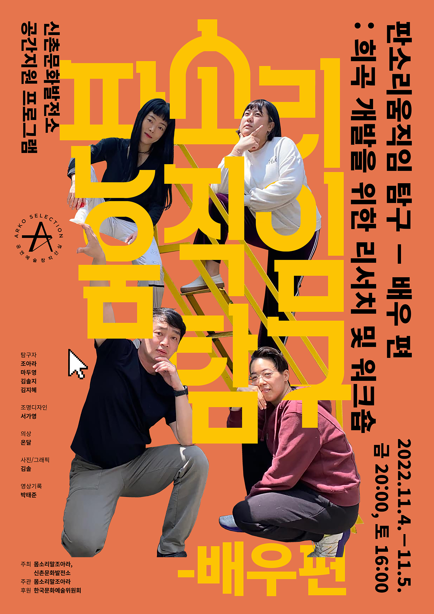 판소리 움직임 탐구 배우 편은 서로 뿌리와 분야가 다른 네 명의 탐구자가 판소리 움직임이라는 큰 주제를 중심으로 모였을 때, 어떤 종류의 확산적 탐구 방향성이 제시 되는 지를 실험하는 프로젝트 입니다. 판소리 창작자/안무가/배우인 조아라, 고수/전통 연희 퍼포머/뮤지션/배우인 김솔지, 배우 마두영, 드라마터그 김지혜가 모여 2022년 3월부터 4월 사이 8회 차의 1차 워크숍을, 9월부터 11월 사이 10회 차의 2차 워크숍을 진행 하였습니다. 이 여정을 끝마치고 각자의 분야로 복귀했을 때, 새로운 문을 열어 주는 다양한 질문을 손에 쥐고 돌아가는 것이 궁극적인 목표입니다.