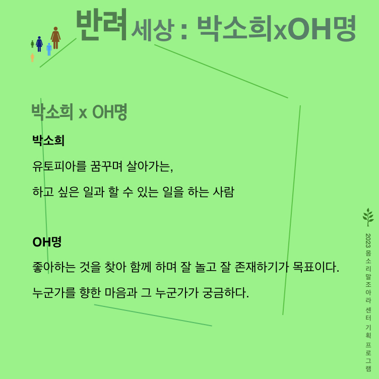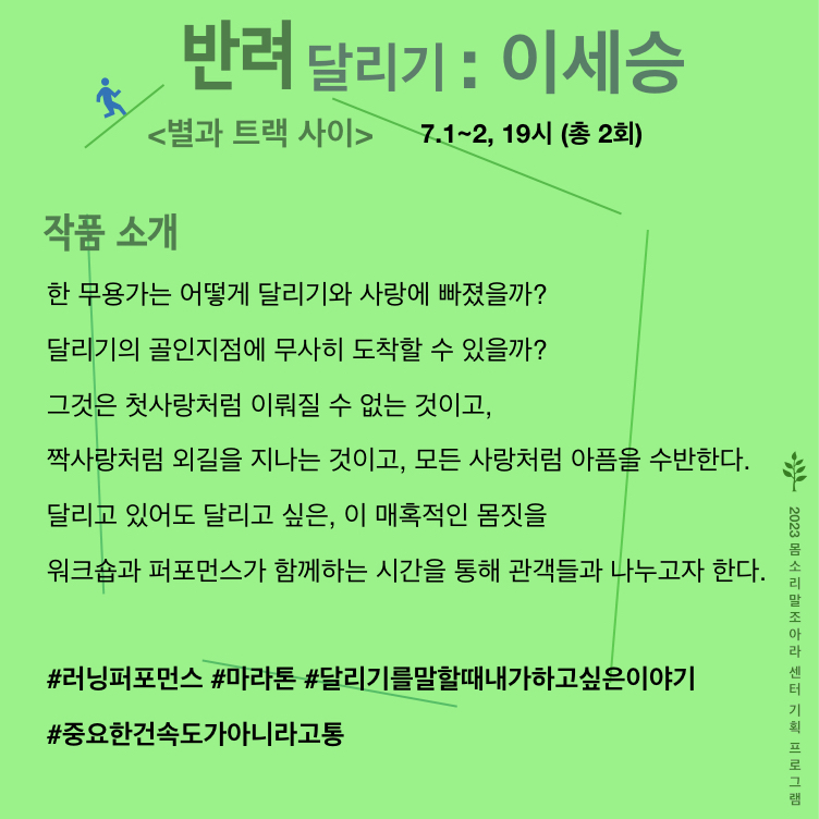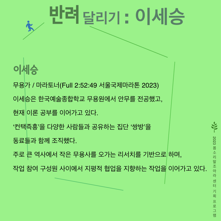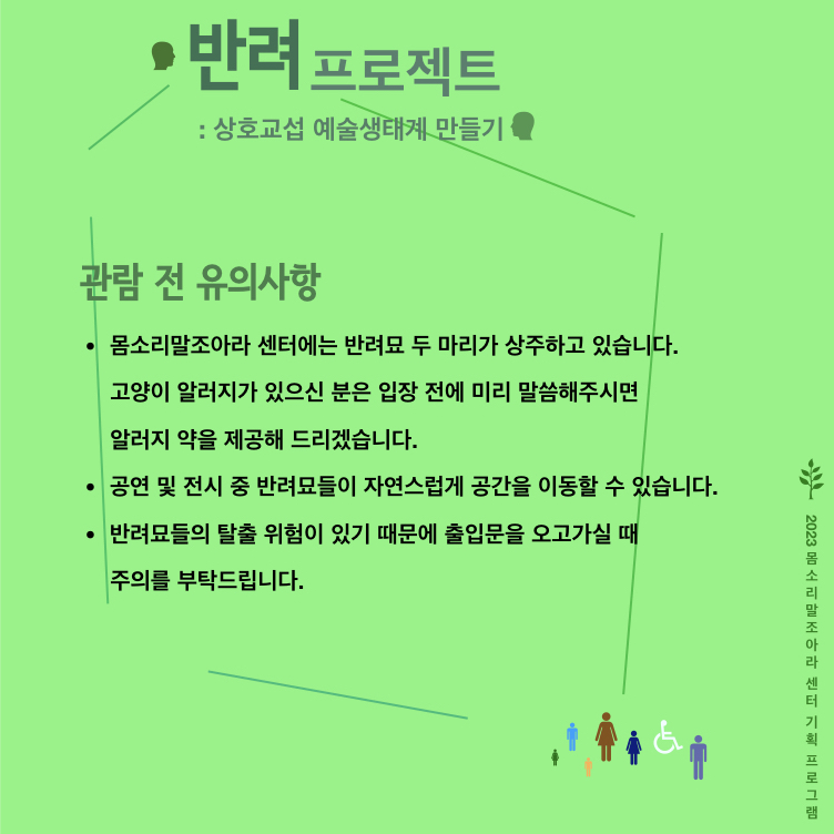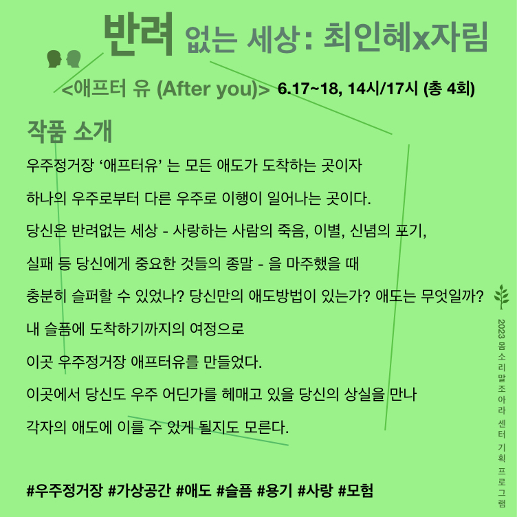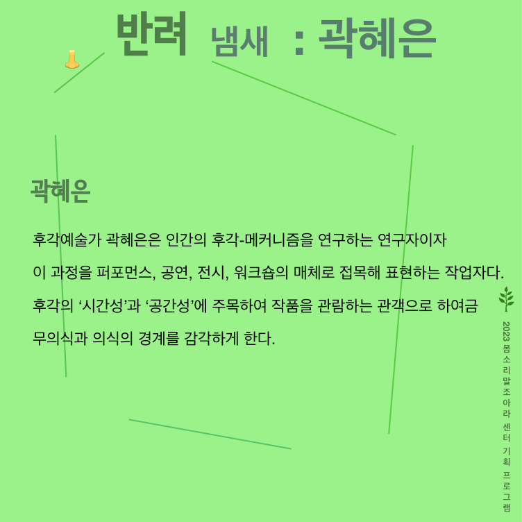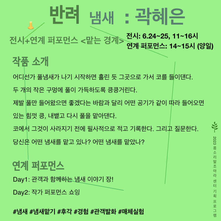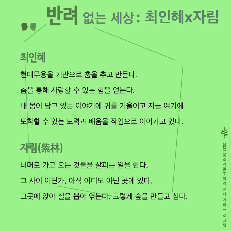 <반려 프로젝트>의 발표 공간인 ‘몸소리말조아라 센터’는 삶, 쉼, 숨을 나누며 관계를 일궈내는 예술적 공간으로서 예술가들의 활동을 지지하고 품는다.