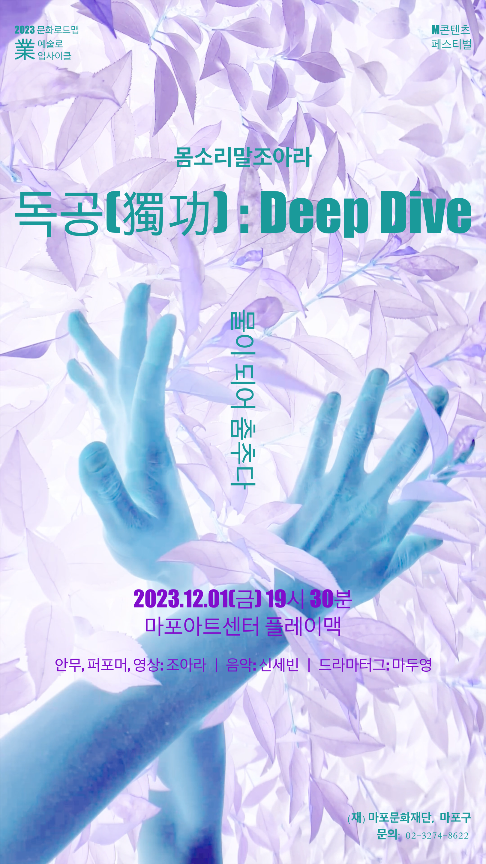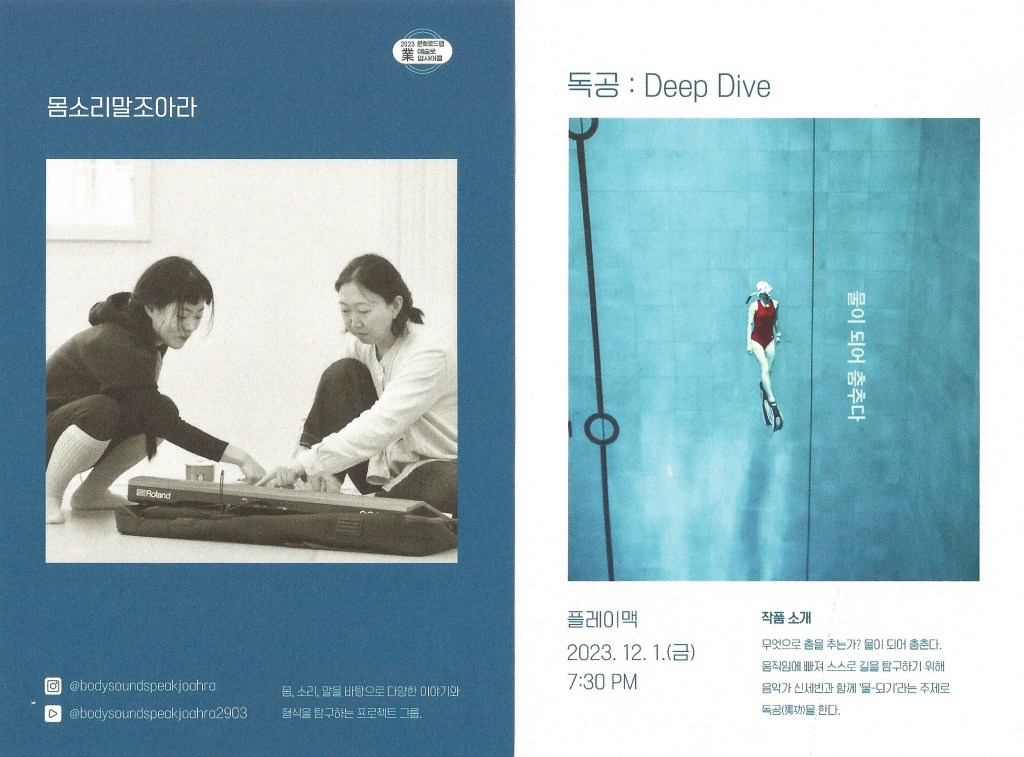 독공(獨功)이란 소리꾼이 선생으로부터 배운 소리를 더욱 정밀하고 자세하게 닦고, 더 나아가 자기만의 더늠을 만들기 위해 홀로 공부하는 것을 말한다. 판소리를 전공하고 이후 연극과 무용 창작을 전공한 조아라는 판소리가 아니라 무용으로 ‘물-되기’라는 주제로 독공을 한다. 퍼포머 조아라와 음악가 신세빈은 리허설을 통해 찾은 움직임과 음악 소스를 기반으로 ‘물-되기’를 움직임으로 구현한다.