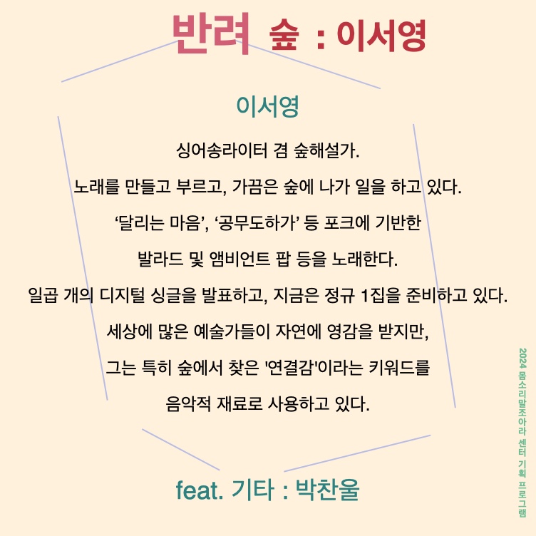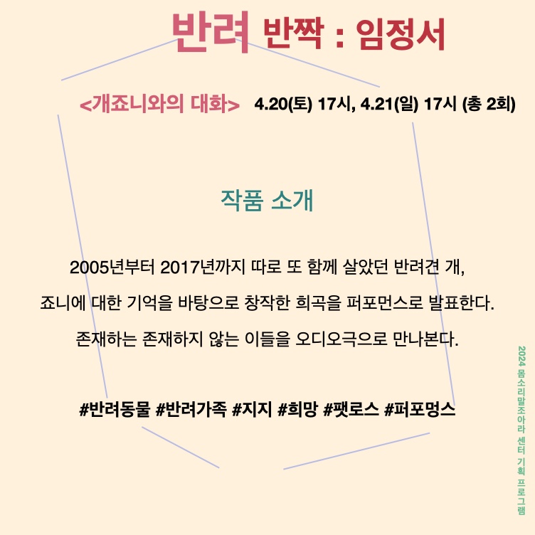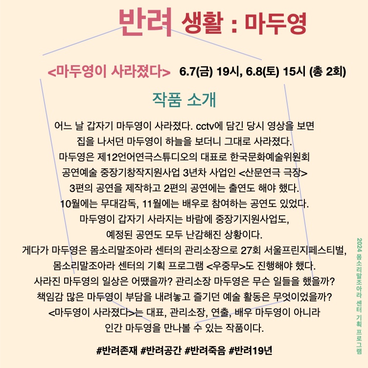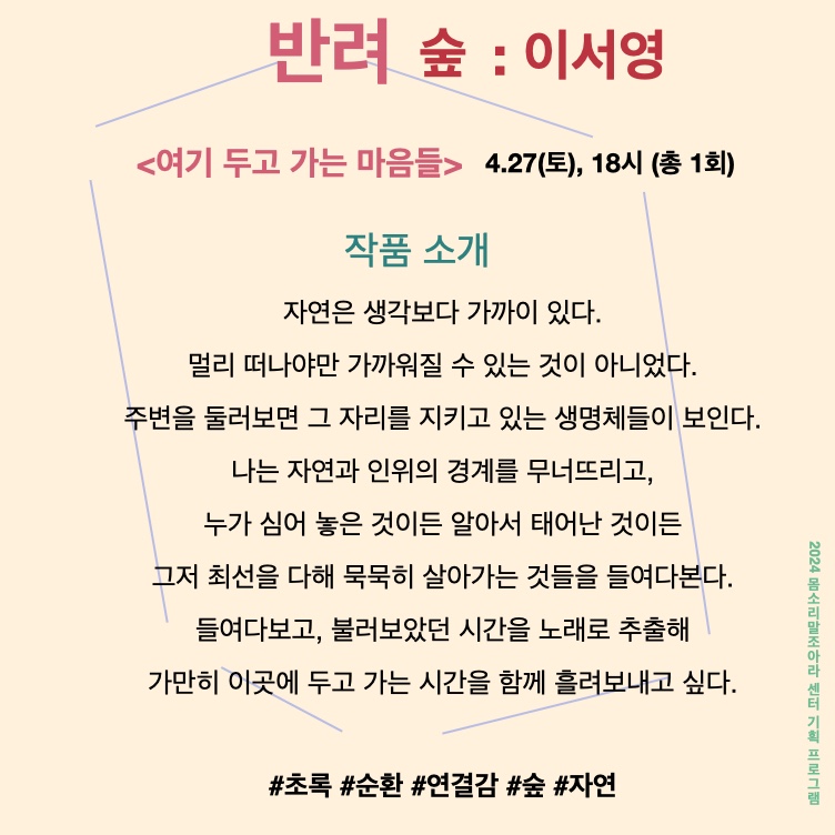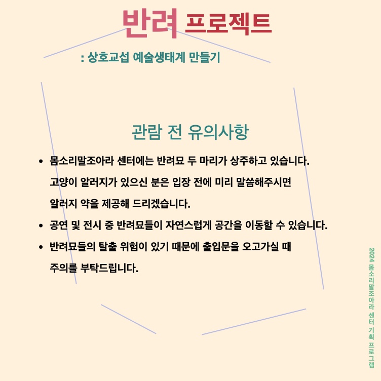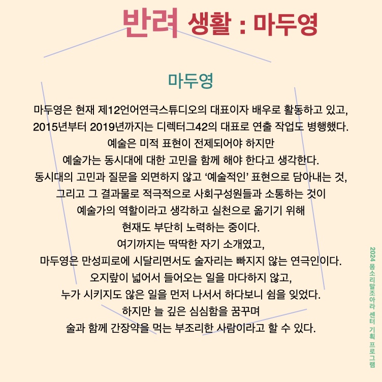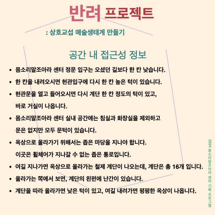 <반려 프로젝트>의 발표 공간인 ‘몸소리말조아라 센터’는 삶, 쉼, 숨을 나누며 관계를 일궈내는 예술적 공간으로서 예술가들의 활동을 지지하고 품는다.