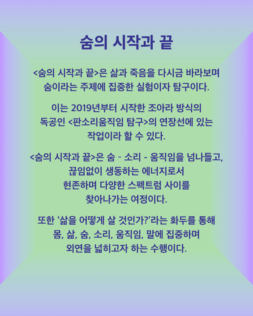 숨의 시작과 끝 2024 (The Beginning and End of Breath 2024) on 12월 17, 202412월 17, 2024 By bodysoundspeakjoahra 이 글 공유하기: X에 공유 (새 창에서 열림) X Facebook으로 공유하기 (새 창에서 열림) Facebook 좋아하기 가져오는 중... 관련